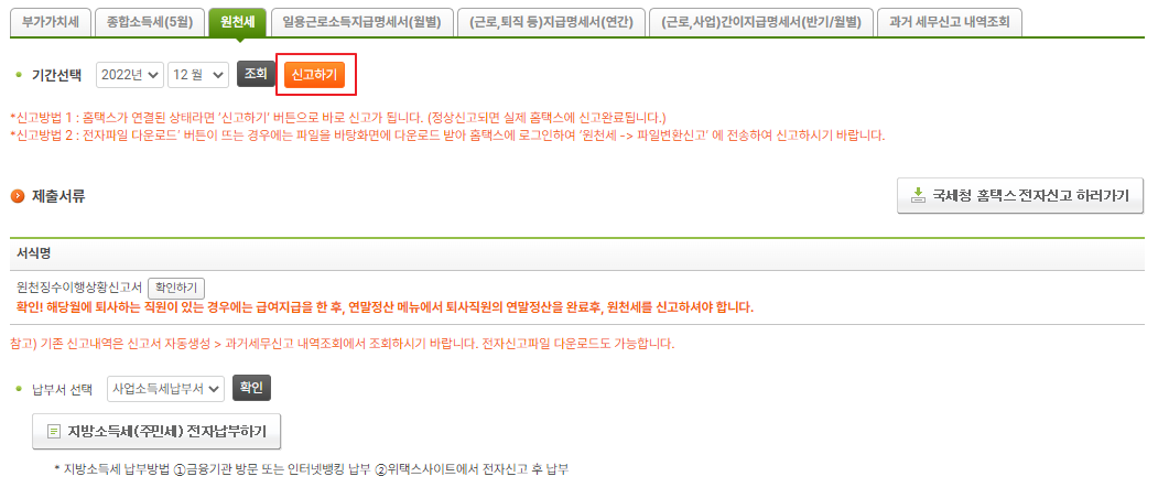 결국 피고용인의 소득세를 월별로 대신 내는 것입니다. ^^ 급여 지급일이 속하는 달의 다음 달 10일까지 원천세 신고 및 납부를 해야 합니다.