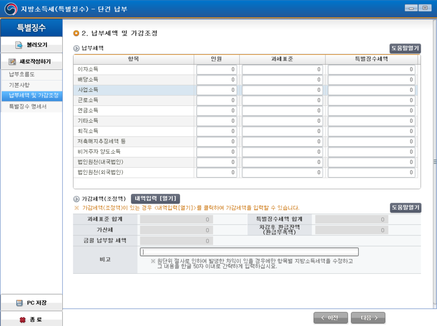 고용인이 근로소득자나 사업소득자가 있다면 몇 명인지 인원을 기입하시고 과세표준에는 홈택스에서 낸 소득세를 넣습니다. 그러면 특별징수세액이 자동으로 계산이 되고 금월 납부할 세액이 나옵니다. 다음을 클릭하여 특별징수명세서를 확인한 뒤 제출합니다.