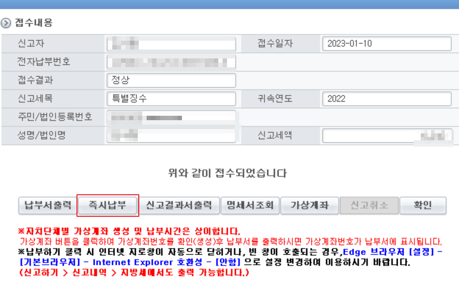 제출 후에는 다양한 방법으로 납부하시면 됩니다. 즉시납부를 선택하시면 안내창이 웹브라우저를 통해서 보이고 안내사항에 따라 진행하시면 됩니다. 저는 이 때도 개인 공동인증서로 진행을 했습니다. 참고해 주세요^^