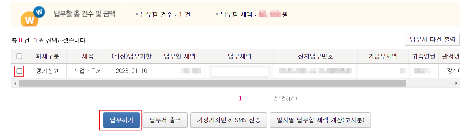 납부할 세액이 나오면 항목을 선택하고 납부하기를 클릭합니다.