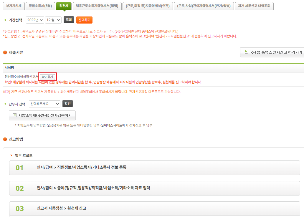 세무신고> 신고서 자동생성 > 원천세