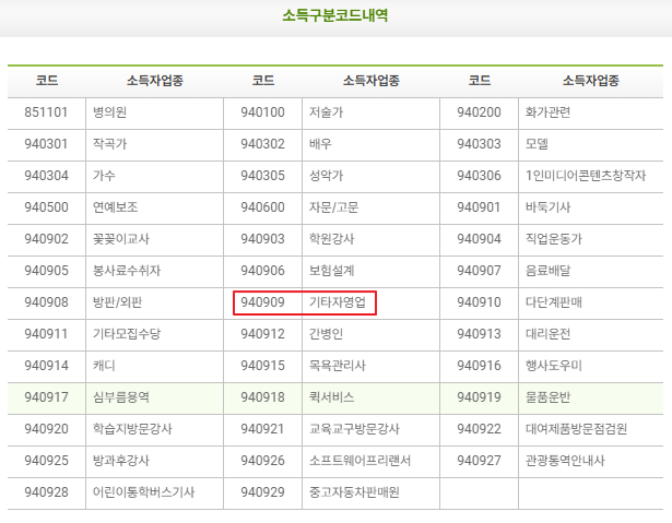 입력하는데 필요한 정보는 이름과 주민등록번호입니다. 소득구분에는 기타자영업 940909 로 입력하면 될 것 같습니다.