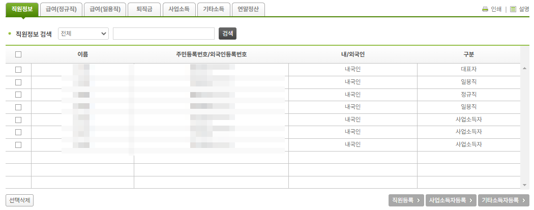1. 정규직, 일용직, 사업소득자 직원등록하기