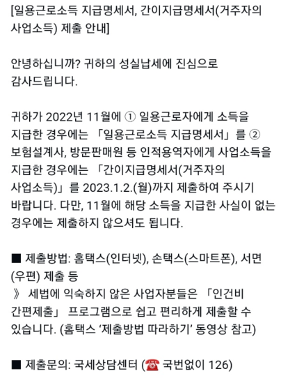 이런 과정을 해 보신 분들은 쉽게 하실 수 있지만 안 해보신 분들은 도대체 무슨 말인지 어렵습니다. 저도 잘 모르지만 제가 아는 선에서 말씀드리면, 일을 하면서 아르바이트를 고용하거나(일용직) 매월 도급형태로 일을 맡기는 경우(프리랜서, 사업소득)에 세금을 제하고(3.3%) 임금을 지급하고 국세청에 신고를 해야 합니다.
