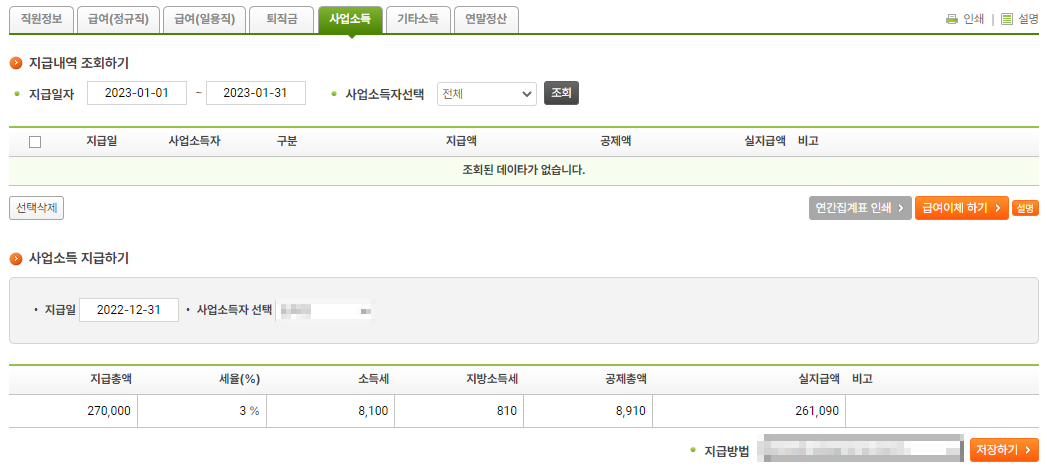 사업소득 탭에서 하단에 사업소득 지급하기를 클릭합니다. 이번달에 급여를 지급하셨더라도 지난달 급여이기에 지급일은 지난달 마지막 날로 설정하였습니다. 지급총액을 입력하면 소득세와 지방소득세가 자동으로 계산이 됩니다. 그래서 실지급액을 사업소득자에게 지급하고 저희는 홈택스에서 소득세 8,100원을 제출합니다. 지방소득세 810원은 위택스에서 제출합니다. 소득세를 고용인이 대신 제출하는 것을 원천징수라고 합니다.(원천징수 - 해당 근로자의 원천세(소득세와 지방소득세)를 사업자가 근로자의 급여에서 먼저 제한 후 국가에 대신 납부하는 제도를 의미합니다.)