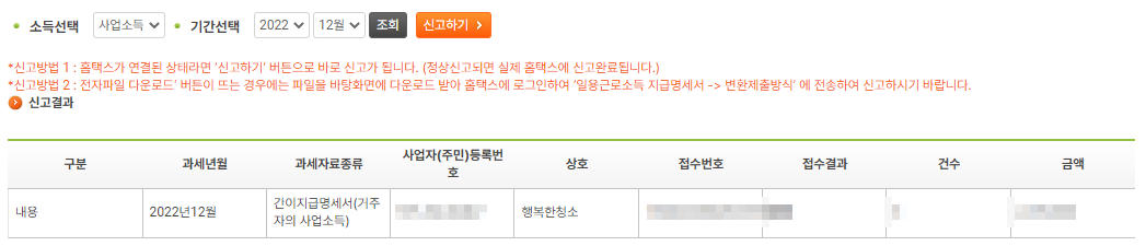 소득선택에서 근로소득과 사업소득이 있는데, 근로소득은 반기별(지급일이 속하는 반기 마지막 달의 다음 달 말일까지 제출)로 제출합니다. 그리고 사업소득은 월별(지급일이 속하는 달의 다음달 말일까지 제출)로 신고합니다(2021년 이후).