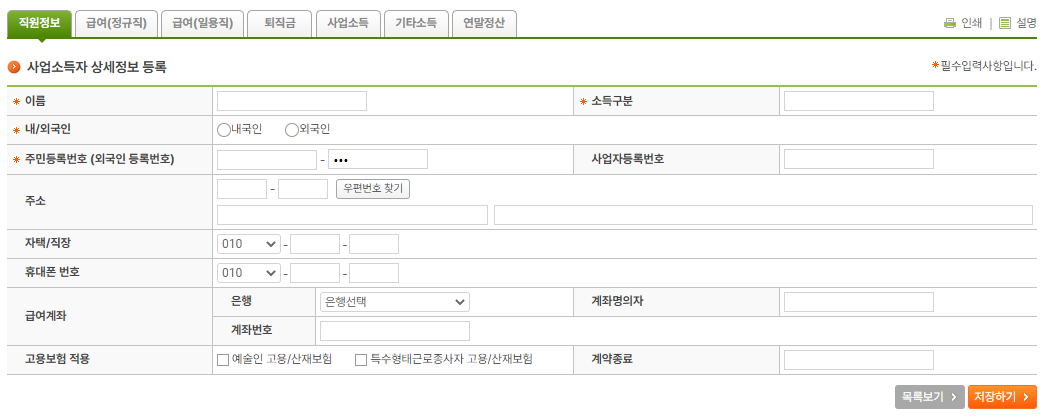 이름, 주민등록번호, 기타자영업 내/외국인을 등록하시고 저장하기를 클릭합니다.