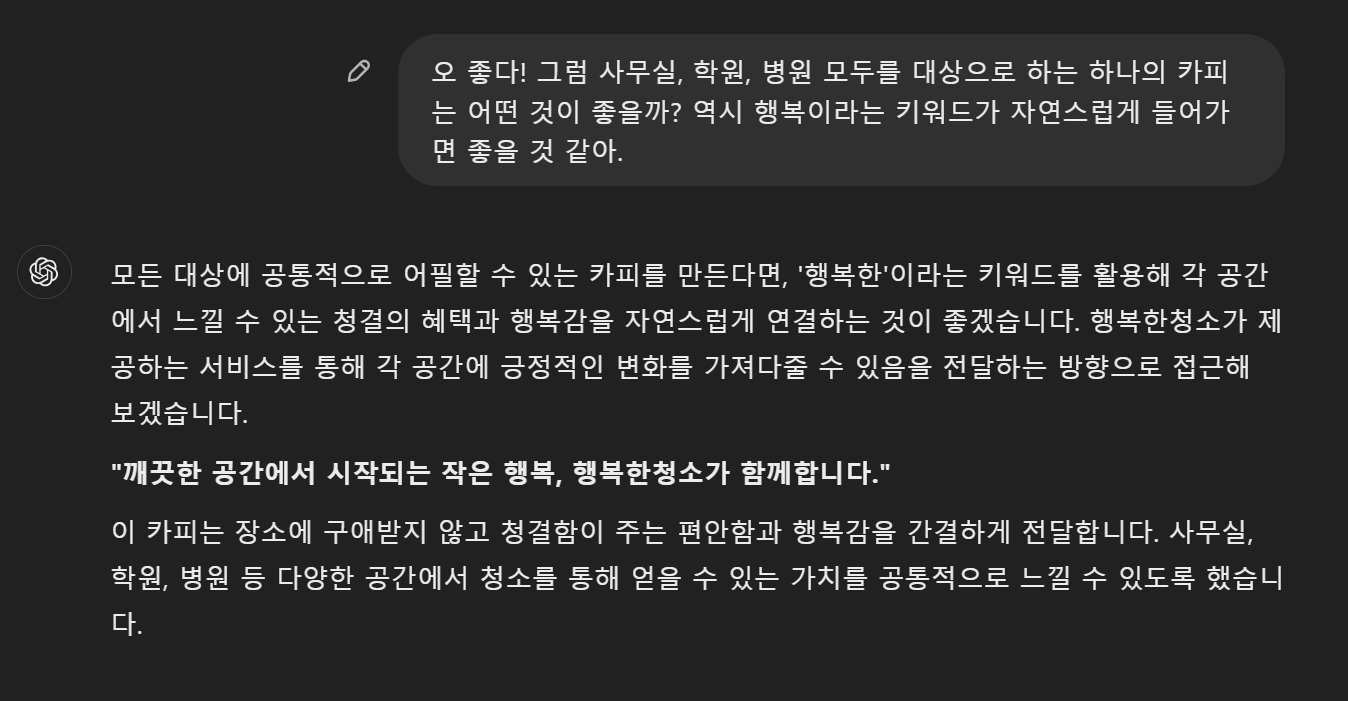 여러분도 챗gpt를 이용해서 홍보문구, 멘트, 카피, 명함 문구 등을 만들어 보세요.