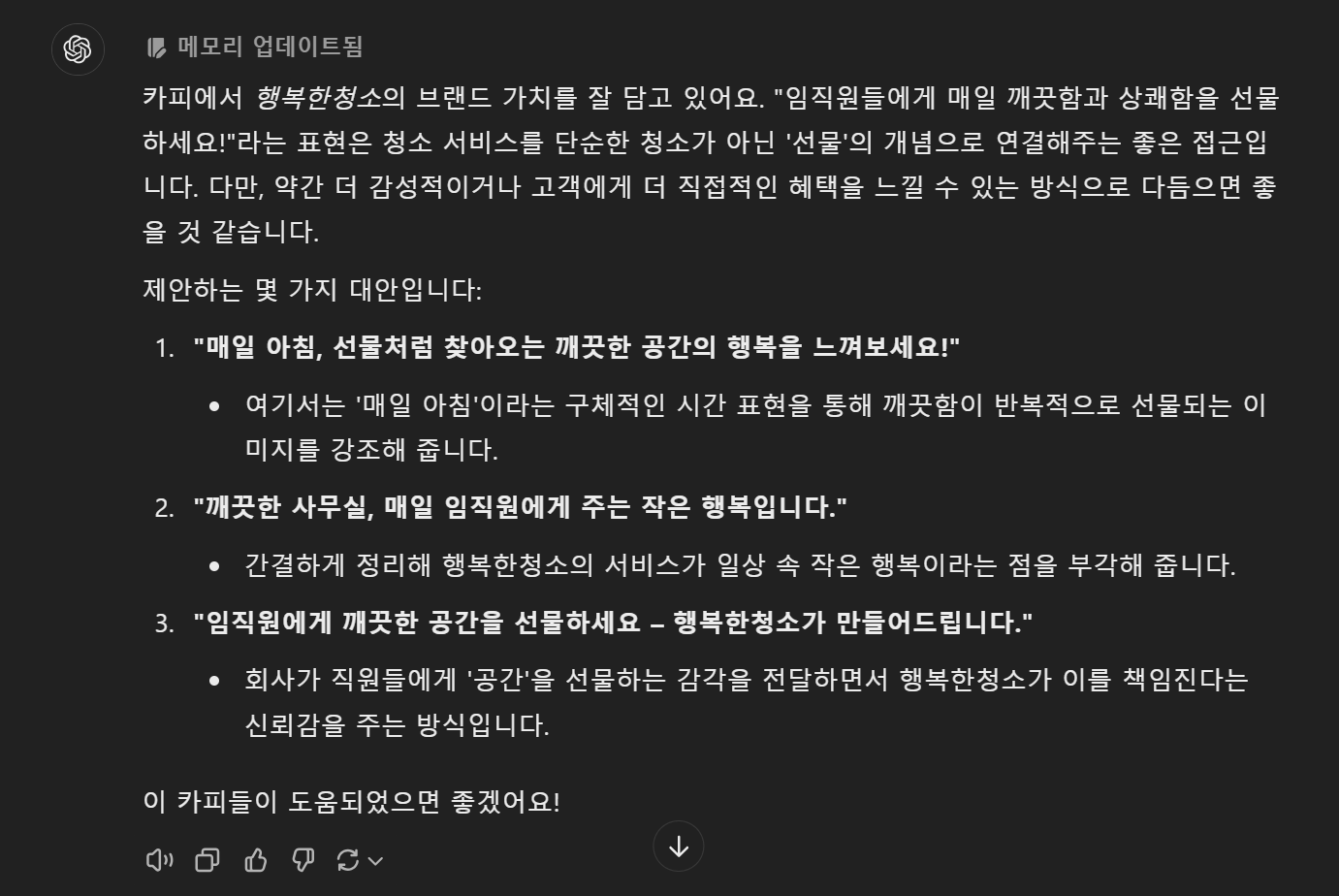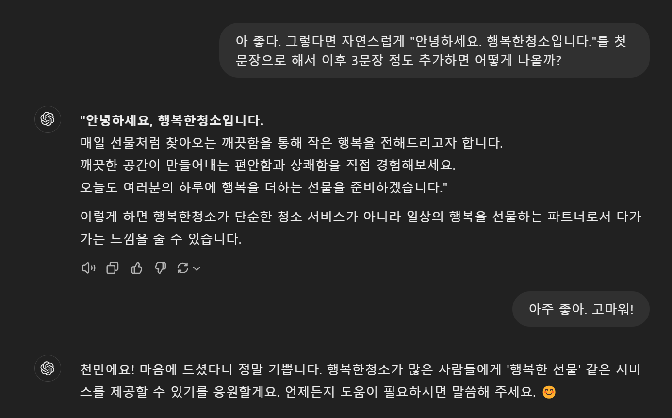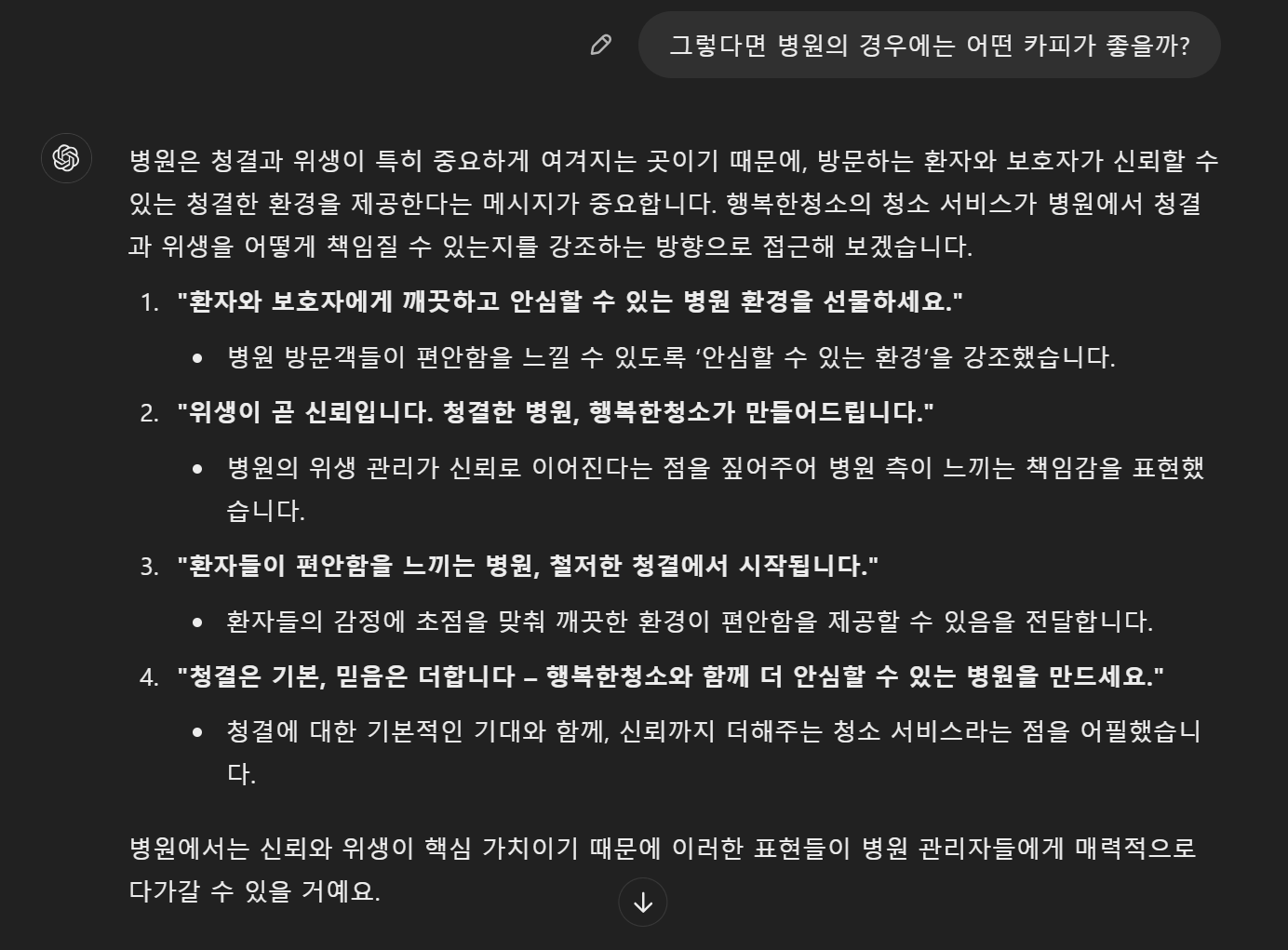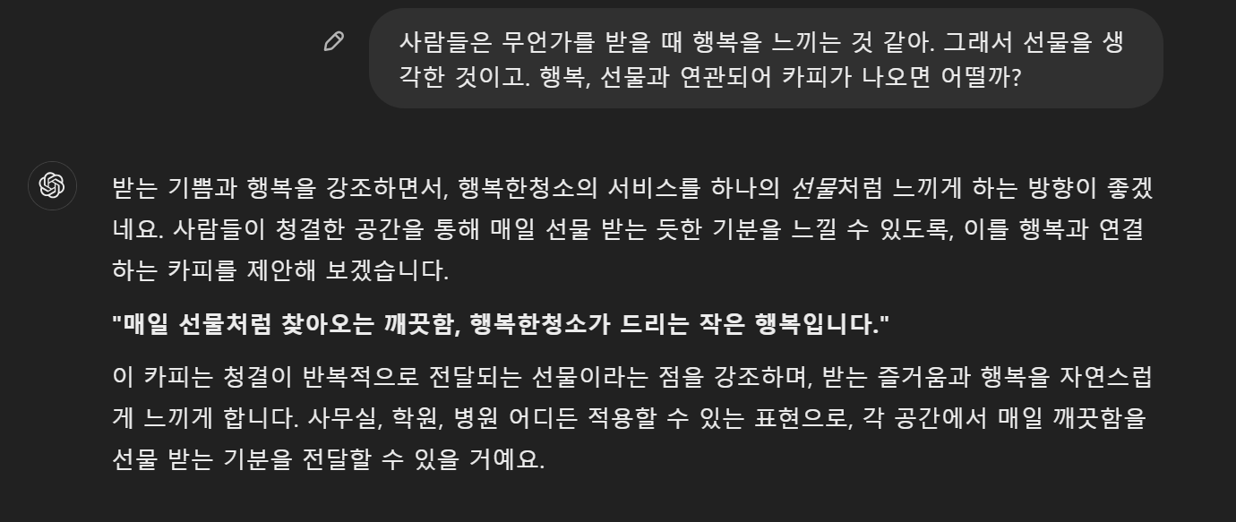 그런데 행복한청소의 '행복'과는 거리가 먼 카피인 것 같습니다. 그래서 다시 물어봤습니다.