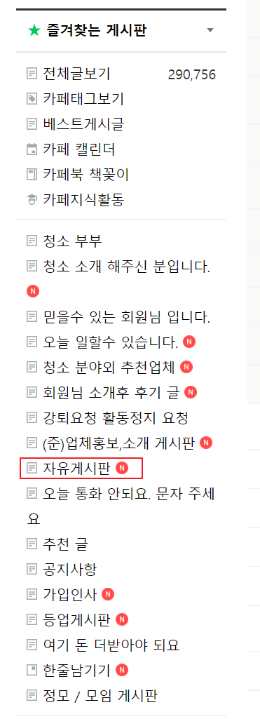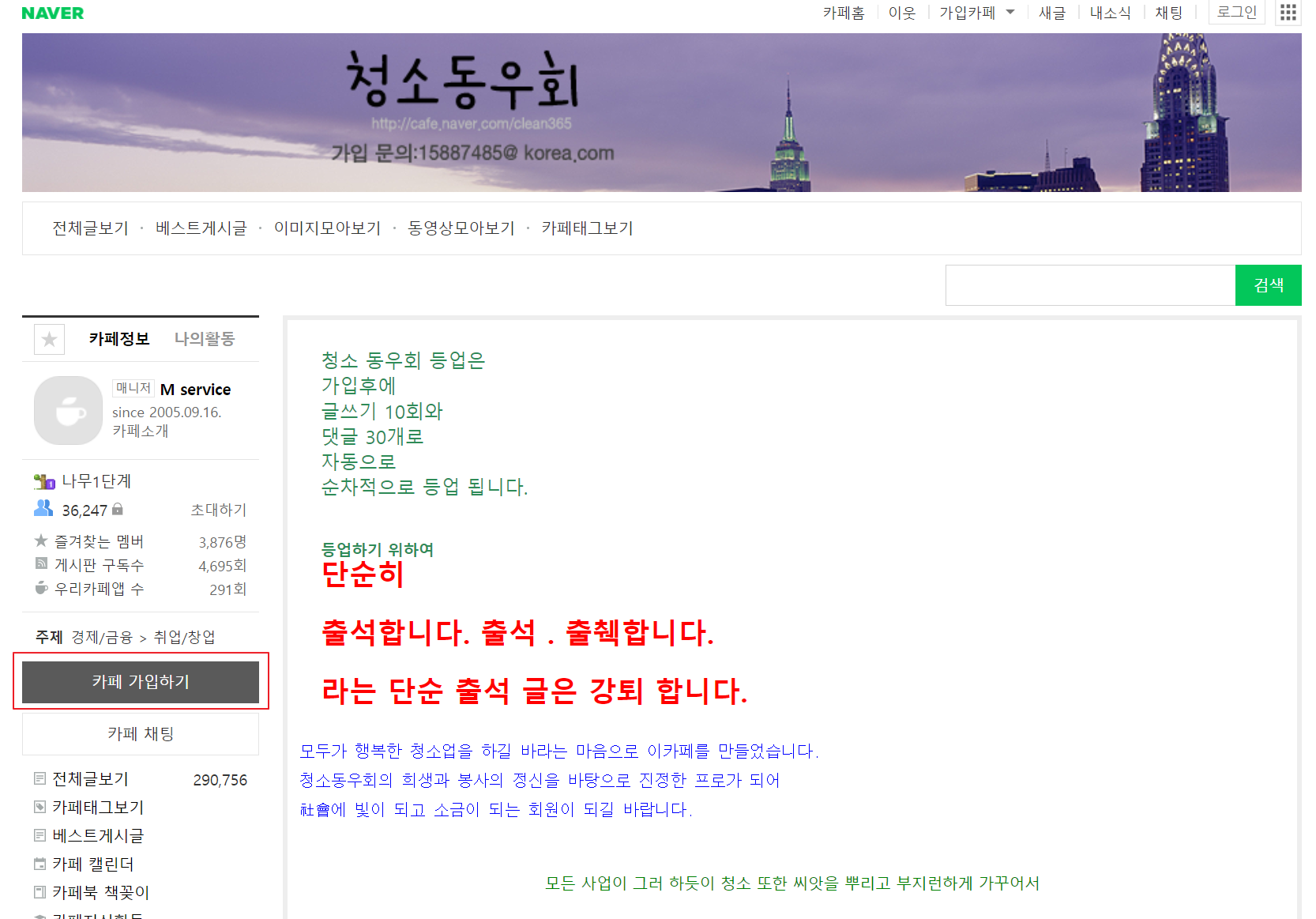 처음 가입하게 되면 카페활동을 할 수 있는 등급이 안되어서 글을 남기거나 접속할 수 있는 메뉴에 제한적입니다. 그렇지만 현재 이 카페는 우리 나라에서 가장 큰 카페입니다. 매일 매일 올라오는 청소관련 정보를 무시할 수 없습니다.