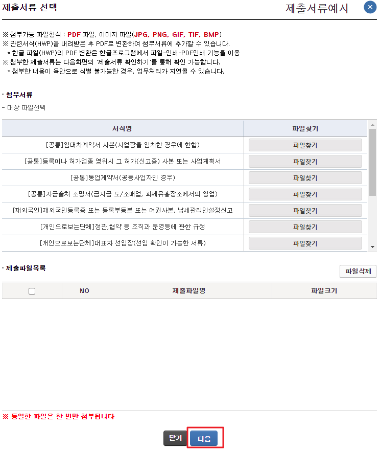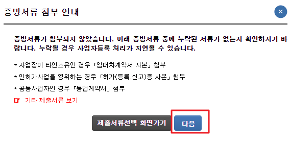 제출할 서류가 없으면 다음을 클릭해 주세요.