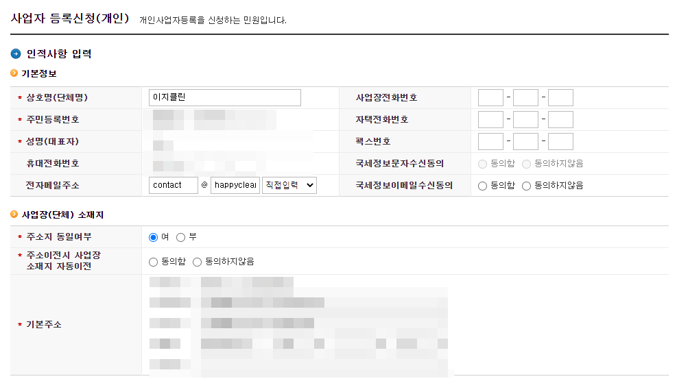 기본정보와 사업장(단체)소재지를 입력합니다. 상호명은 앞으로 저희가 운영해야하는 청소업체 이름이니 쉬운 이름으로 하는 것이 좋겠지요. 예시로 이지클린으로 해보았습니다. 주소이전시 사업장 소재지 자동이전에는 동의함으로 하면 사업장이 이사갈 때 편하겠네요.