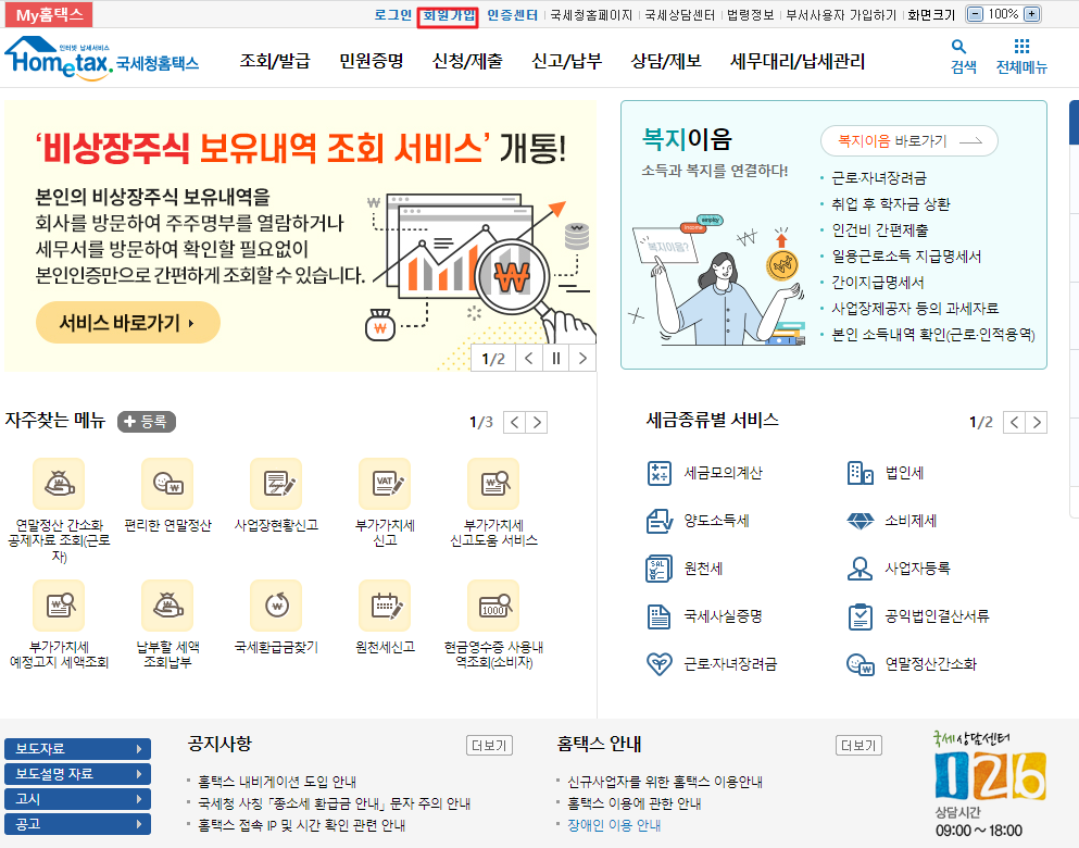 국세청홈택스에서 사업자등록증을 발급해 봅시다. 혹시 회원가입이 안되어 있다면 회원가입부터 해 주세요.
