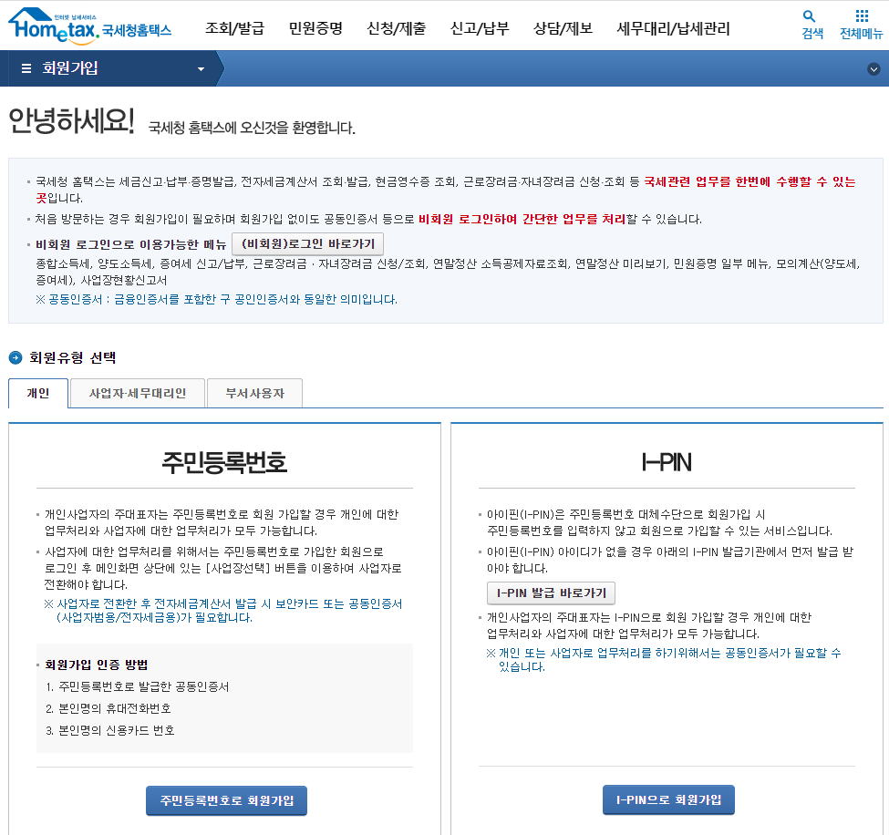 "주민등록번호로 회원가입"클릭하시면 공동인증서 휴대전화 신용카드로 본인의 신원을 확인하시고 가입하시면 됩니다. 물론 아이핀 아이디가 있으시면 아이핀 아이디로 가입하시면 됩니다.