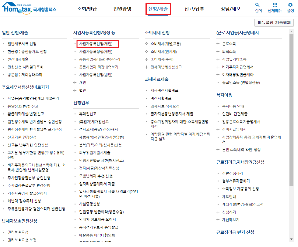 로그인을 하셨다면 신청/제출에 사업자등록신청(개인)을 클릭합니다.