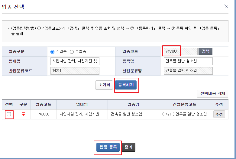 업종선택을 합니다. 업종코드는 749300으로 입력하시면 건축물 일반 청소업으로 등록이 됩니다. 등록하기를 클릭해 주시고 선택한 후 업종등록을 클릭해서 마무리해주세요.