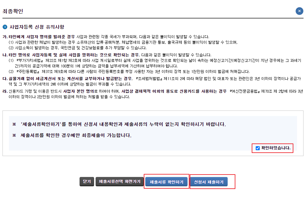 "확인하였습니다."를 체크해 주시고 제출서류 확인하기를 클릭해 주시면 신청서 제출하기 버튼이 활성화 됩니다. 그리고 신청서 제출하기 를 클릭해 주시면 신청이 됩니다.