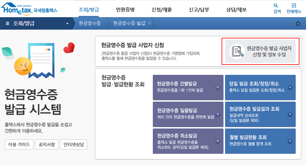 2. 조회/발급 > 현금영수증 > 현금영수증 발급 > 현금영수증 발급 사업자 신청 및 정보 수정 클릭