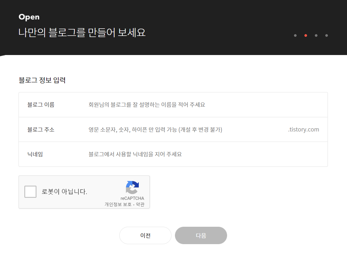 샘플로 아래와 같이 입력했습니다. 블로그 주소는 변경이 안되기에 조금 시간을 들여 생각해 주시기 바랍니다.